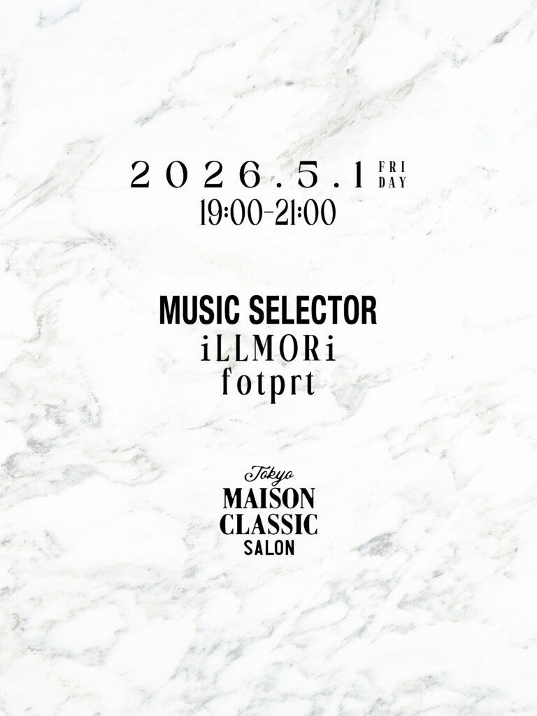 Event fotprt May. 1, 2026 at MAISON CLASSIC SALON May. 1, 2026 at MAISON CLASSIC SALON ■ MUSIC SELECTORiLLMORi fotprt 19:00 – 21:00 – Gallery –